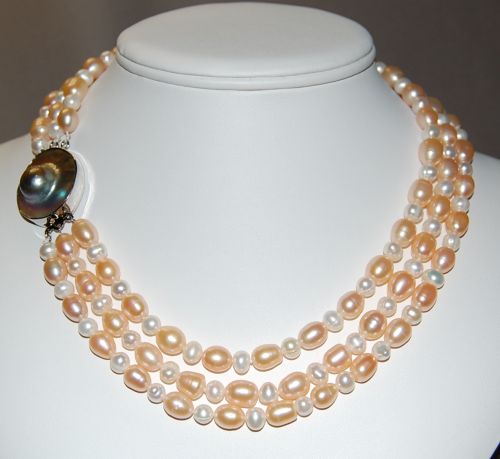 17-18 inch -- Three rows Fresh Water Pearl & Shell Clasp Necklace
