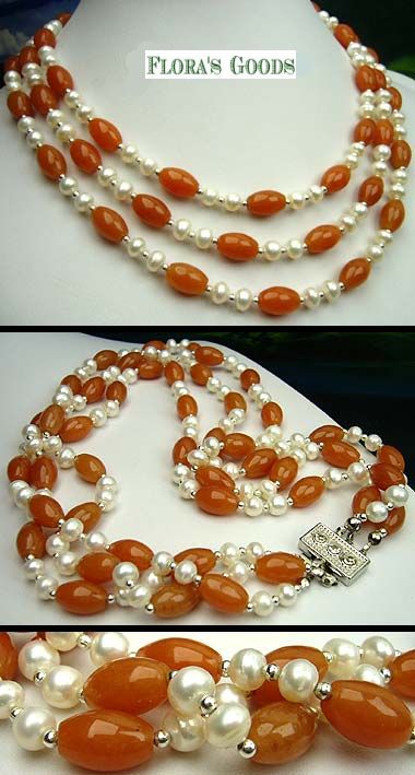 3 rows of Fresh Water Pearl & Carnelian necklace